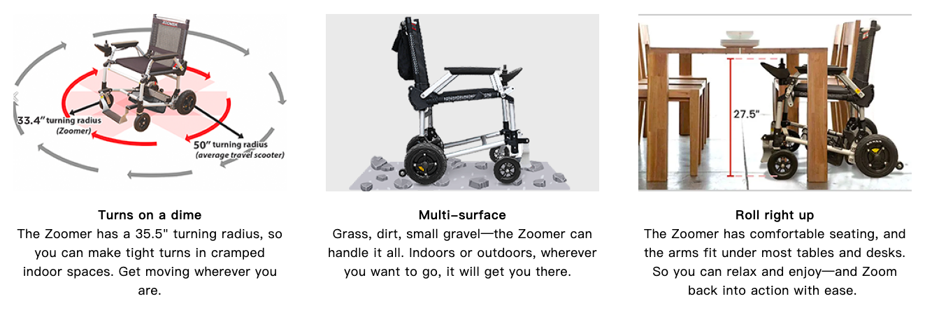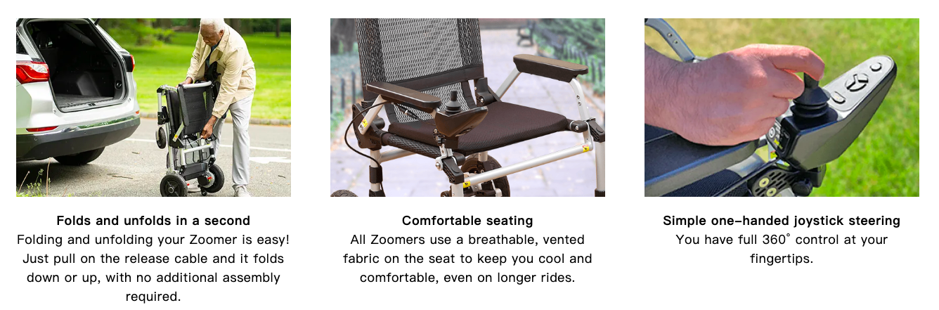 This folding power chair that puts your mobility at your fingertips. With easy one-handed joystick control and extreme portability, Zoomer works indoors and out to help you go almost anywhere your heart desires. Now you can take that "roll" in the park you miss or shop until you drop without slowing down.