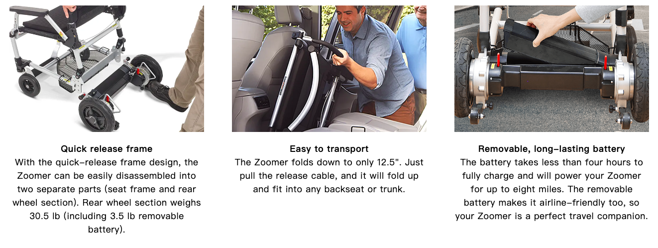 - FAA compliant and safe for travel — Now you can take that dream trip you always wanted. Take your Zoomer right up to the gate, remove the battery and carry it onto the plane, and the airline will take your Zoomer to stow it below. As you come off of the plane, you can get right back in your Zoomer and Zoom through the airport with ease.